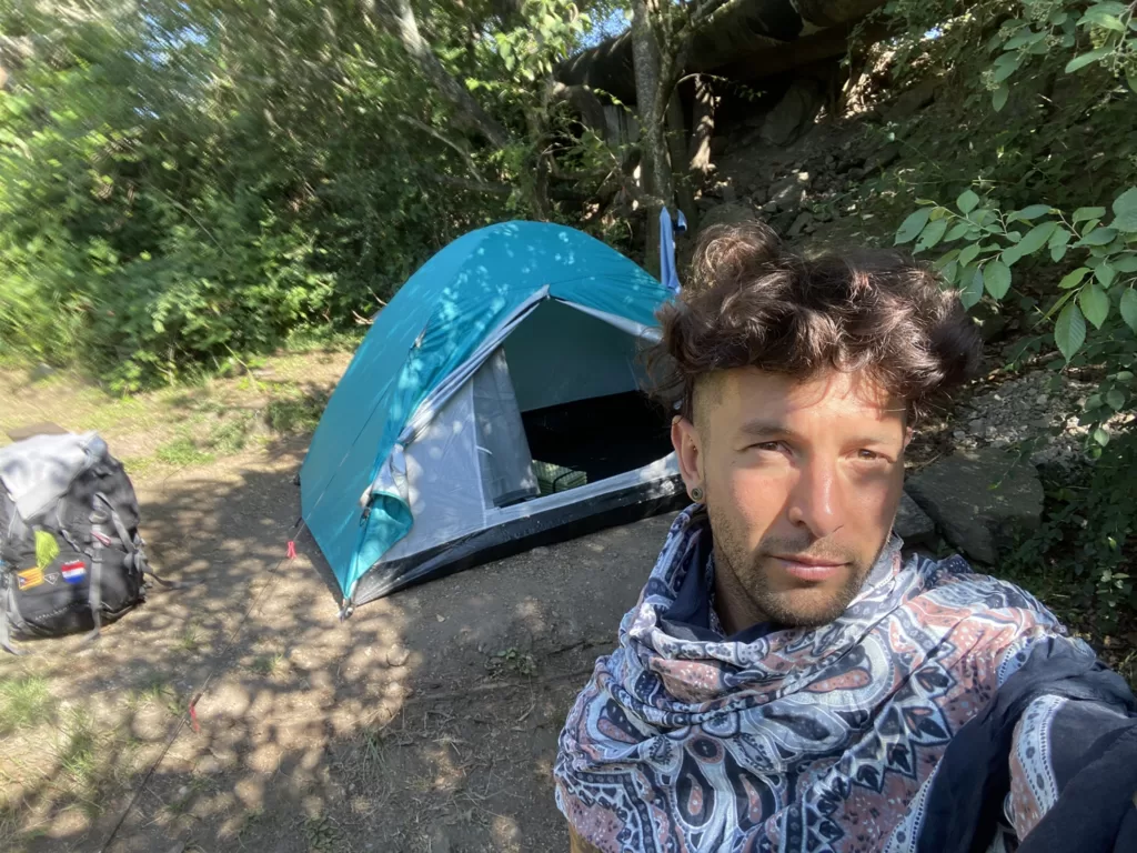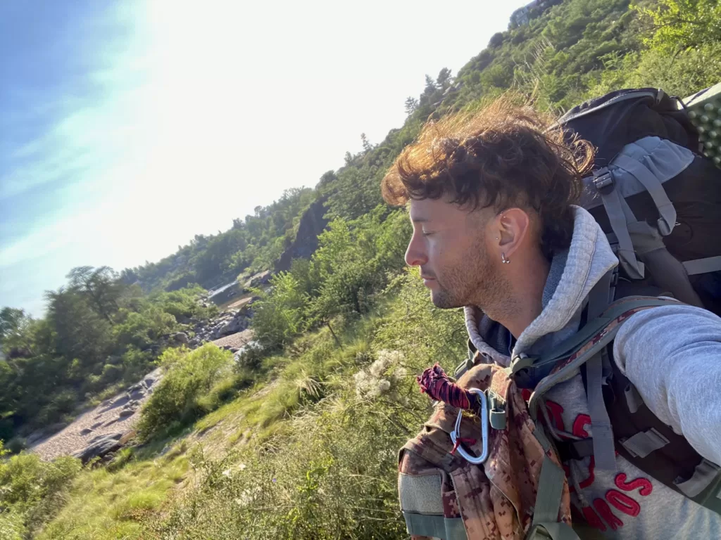 Subir la colina con todo el peso no es opción. Así que busco a quien dejarle mis cosas. Sin ser prejuicioso ninguno me da mucha confianza. 😑 Hasta que escucho una señal. Es naza con su guitarra (Uno de los chicos a quienes les indiqué el camino la noche anterior).