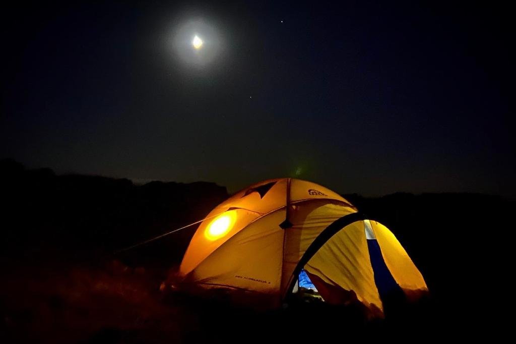 Vimos el atardecer y poco a poco en el descenso se fueron prendiendo las estrellas. Tocó una noche despejada con una luna divina.